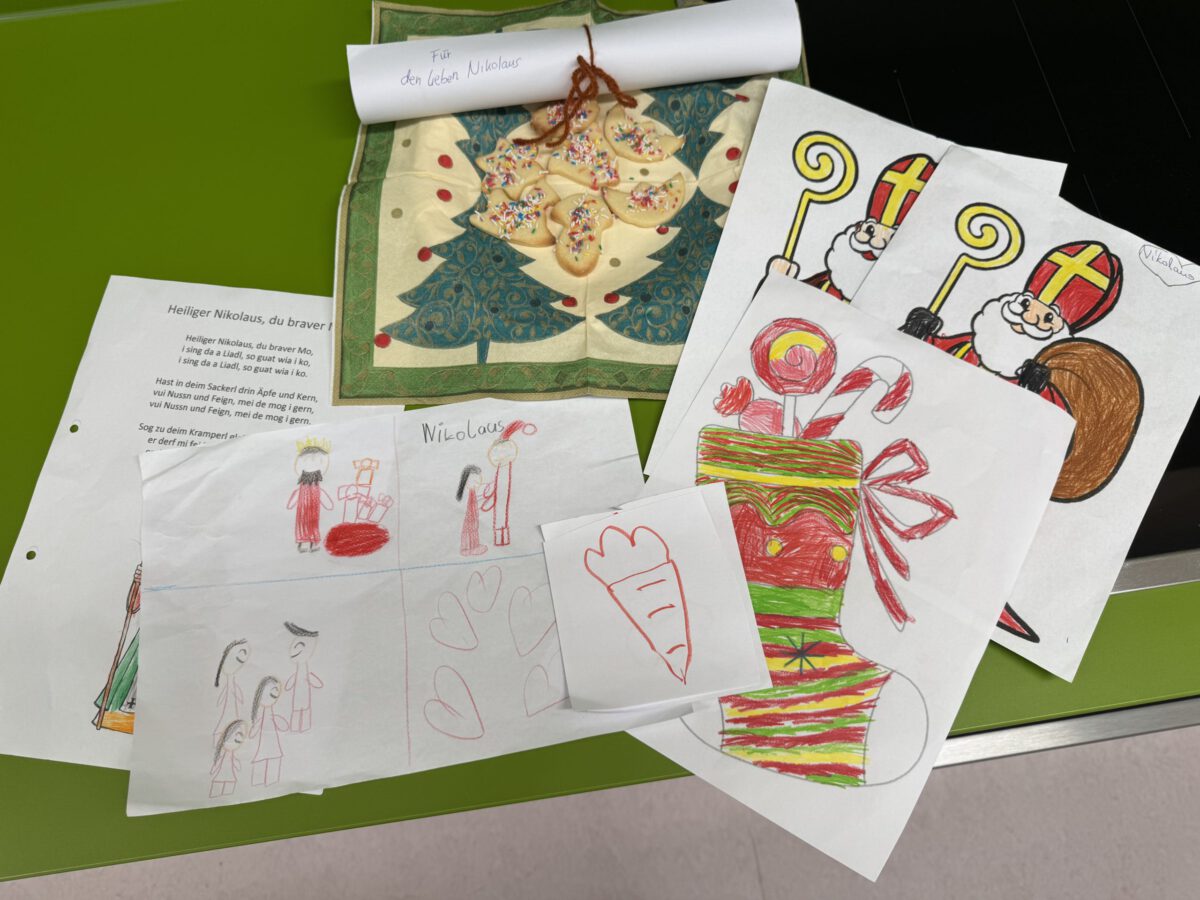 Der Nikolaus las für alle Kinder etwas aus seinem goldenen Buch vor. Neben Liedern und Gedichten, wurde der alte Mann dann auch mit Bildern und Plätzchen beschenkt!