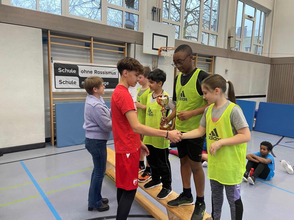 Bei Hip-Hop-Beats und Fan-Gesängen wurde die Turnhalle wieder zu einer Basketballarena. Excel und sein gelbes Team zeigten bei der Unterstufe die beste Teamleistung auf dem Platz. Beim Turnier der Mittel & Oberstufe ging wie im letzten Jahr unser Schülersprecher Nikola mit seinem Team als Sieger hervor. Überglücklich bekamen die Spieler von Frau Bösl den Pokal und ihre Urkunden überreicht.