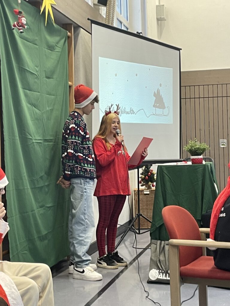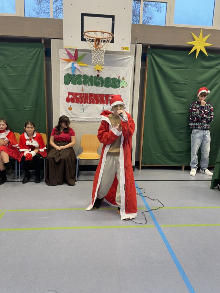 Lucas eröffnete das besinnliche Fest mit einem Gitarrensolo und spielte später noch Schlagzeug. Weitere musikalische Darbietungen gab es von Soraja, Jamelia, Sofi, Emily und Matej. Die Klasse 8 und die Ethikgruppe der Klasse 9 lieferte Videobeiträge rund ums Thema Weihnachten. Außerdem führte die gesamte Mittelstufe gemeinsam mit der Klasse 4 vom Möhrenbach einen Tanz auf. Der Weihnachtsmann verteilte im Namen der SMV am Ende noch eine kleine Weihnachtsschokolade für alle.
